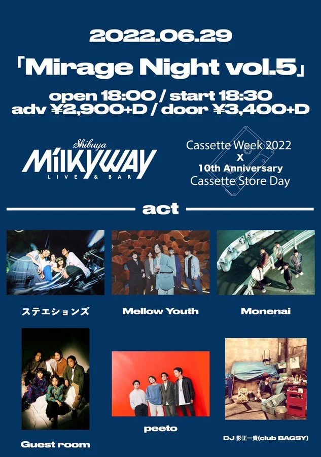 2022年6月ライブのご案内(6/29) "Mirage Night vol.5"2022年6月に開催されるライブイベント"Mirage Night vol.5"への出演が決まりました!2022/6/29(WED)@Shibuya Milkyway Monenai musicJune 16, 2022